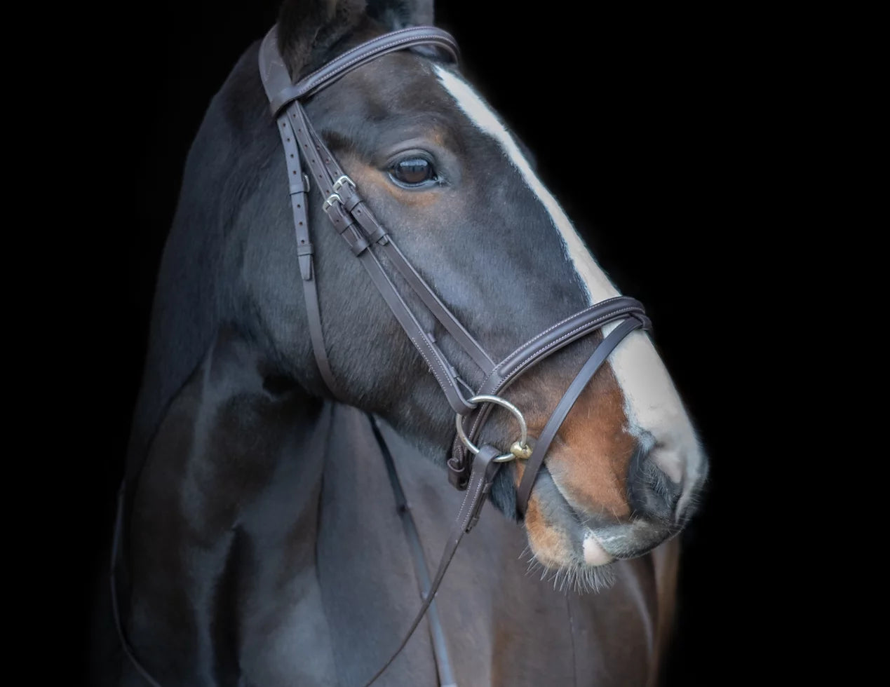 A new bridle developed with an anatomic headpiece with soft padding to help alleviate unwanted poll pressure. Raised and padded browband and noseband offer a balanced elegant look. Includes a flash and sure grip reins. 5/8” cheeks.