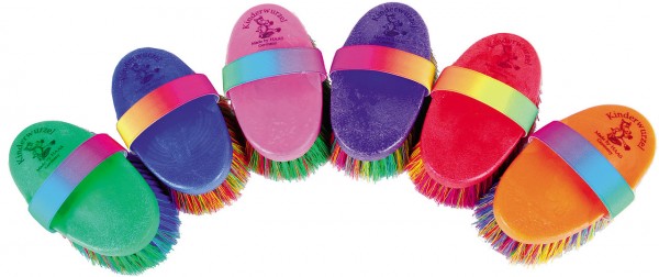 Haas children’s root brush, multi. Colorful imitation rice root bristles for intensive cleaning. The elastic rainbow strap adapts perfectly to children’s hands., 150×75 mm, sorted by colour