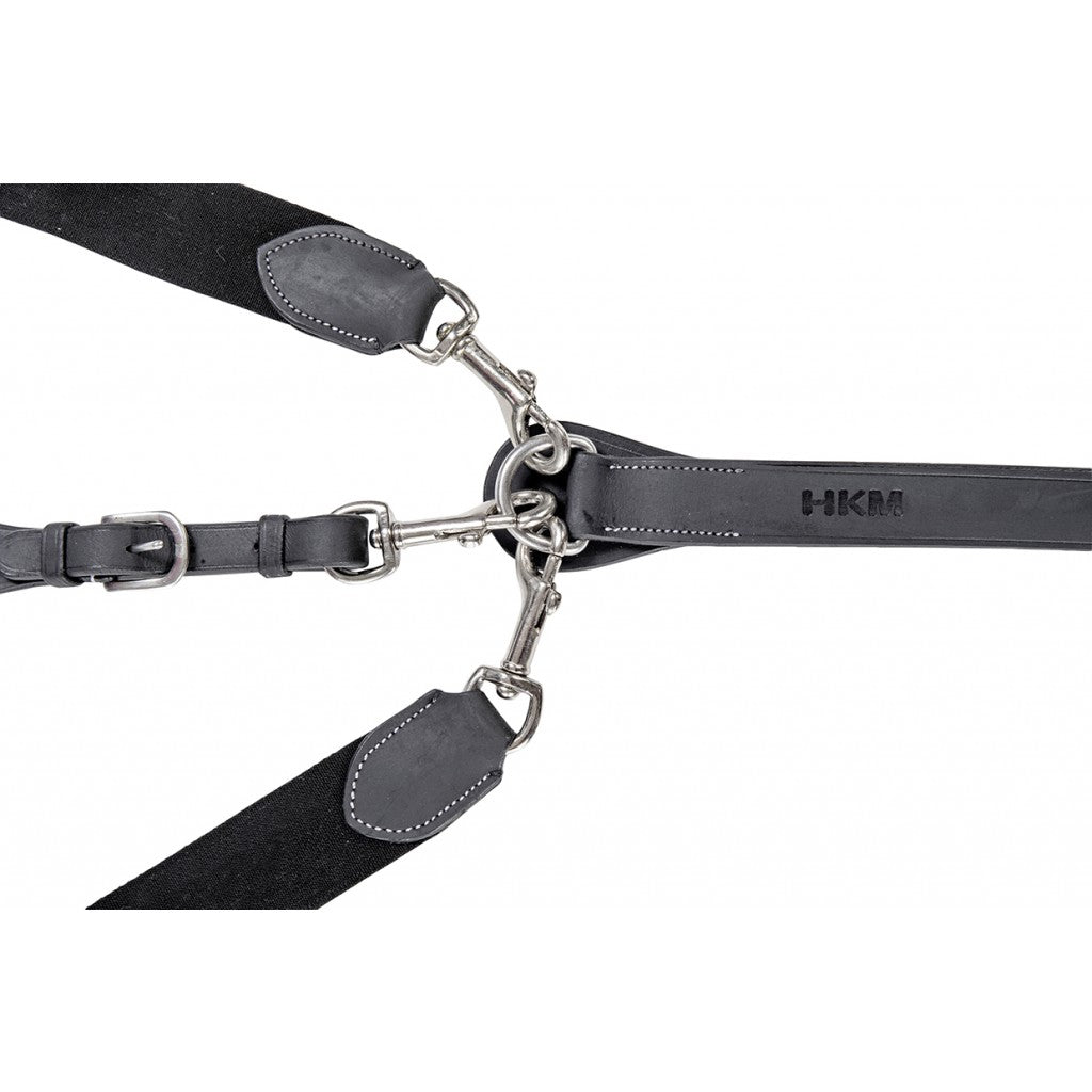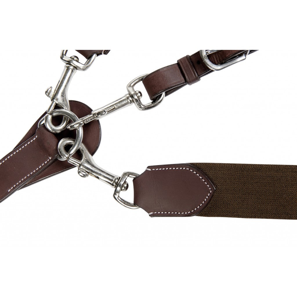 durable and hard wearing– weatherproof– insensitive to moisture– quality leather– martingale is detatchable– strong silver coloured fittings– snap clips– elasticated insert– adjustable velcro fit