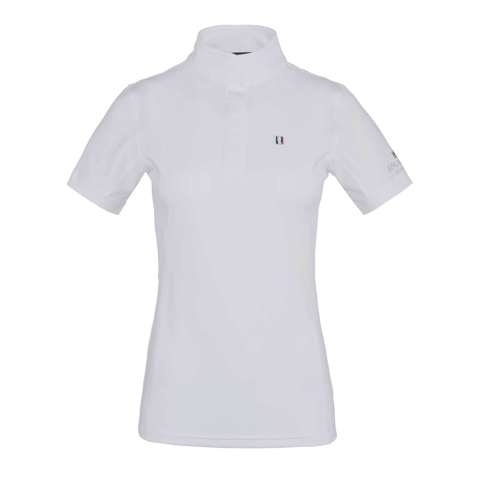 Ladies functional high performance show shirt. Breathable, quick dry technical fabric. Mesh under sleeves for good ventilation. 3 coloured striped neck tape inside collar. Front placket with hidden snap buttons. Logo embroidery on chest and leftsleeve.