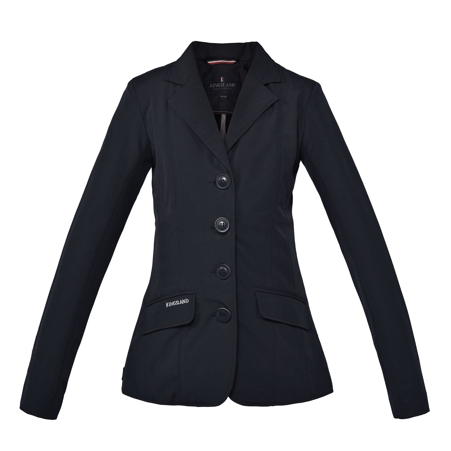 Show jacket in woven softshell fabric. Kingsland embroidery on right pocket. KL logo buttons in front and on sleeves. Kingsland corporate silicone patch on lower right back. Binding on all inside seams in grey fabric. Machine washable 30°C.