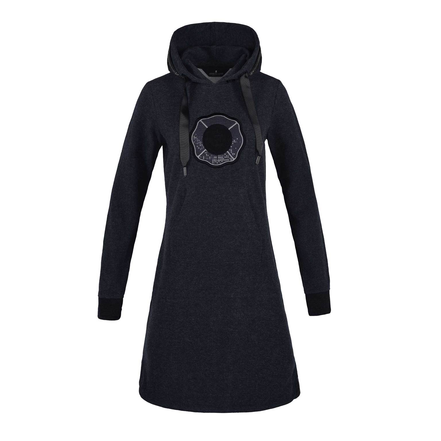 Soft French terry sweat dress with hood, feminine fit, 320 g/m2 . Slightly brushed inside. Tape with metal stripes on hood edge and side slits. Kangaroo pocket. Hood with logo on eyelets and drawcord stoppers. Satin tape drawcord. Big embroidery with sequins on chest.